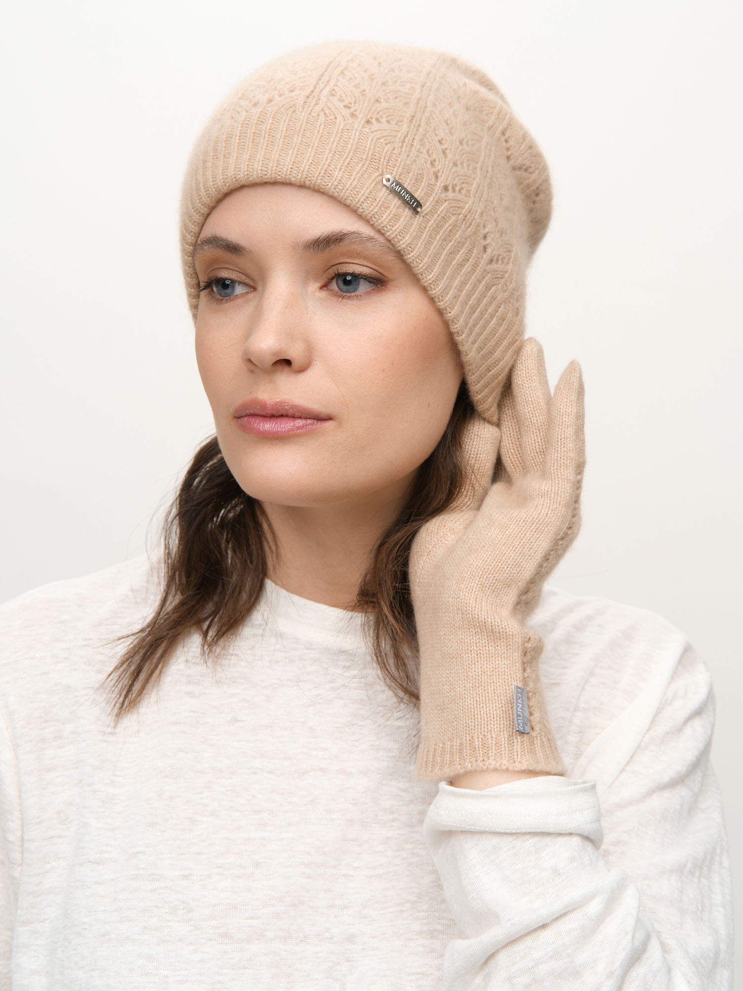 Кашемировая шапка в бежевом оттенке — утончённая модель с ажурной фактурной вязкой, которая сочетает комфорт, лёгкость и элегантность. Натуральный кашемир мягко окутывает теплом, создавая ощущение уюта даже в холодные дни. Лаконичный дизайн с деликатной металлической брендированной пластиной подчёркивает премиальный характер изделия. Универсальная модель для базового гардероба в спокойной нейтральной гамме.