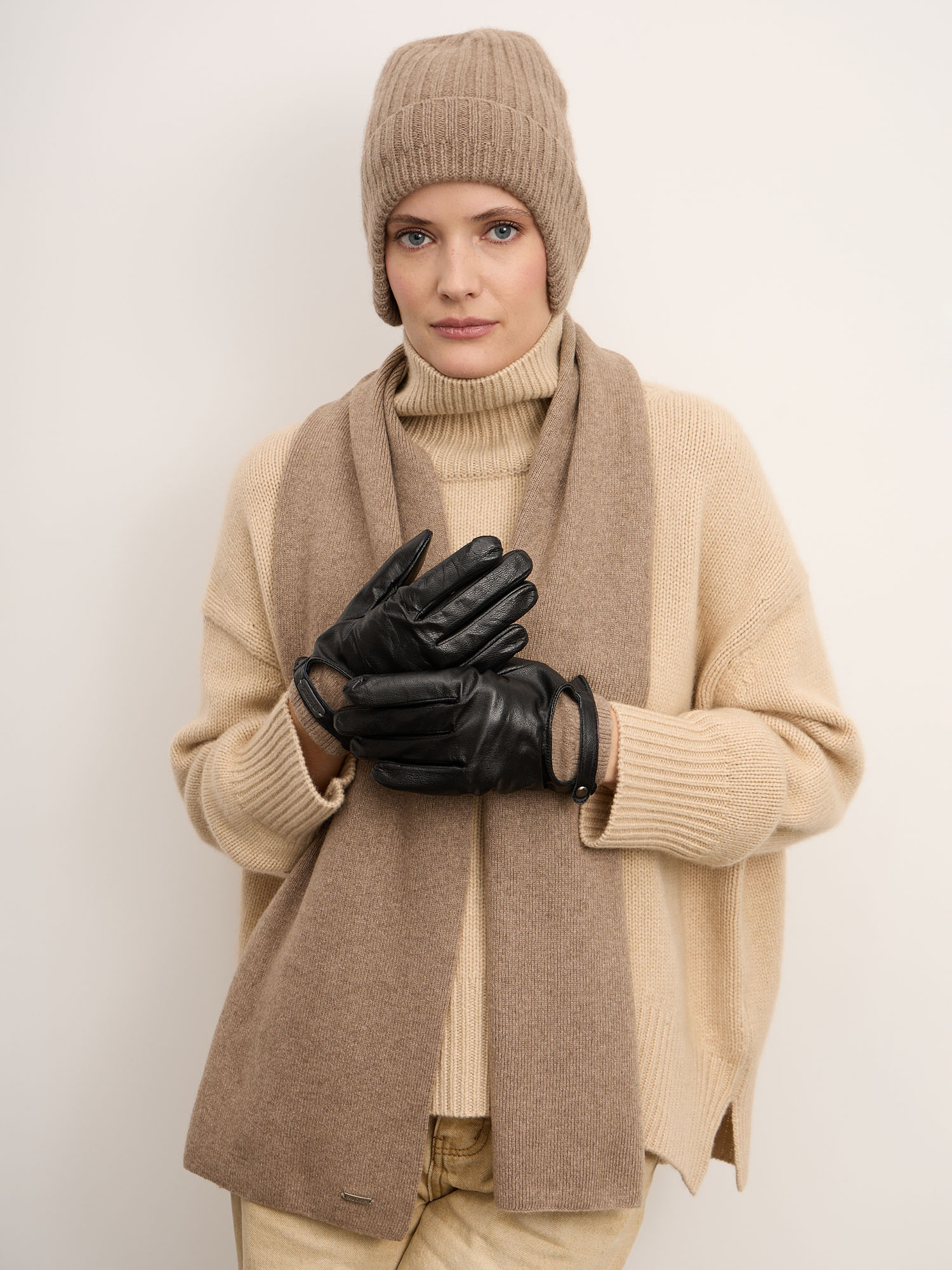 Эти перчатки — воплощение утончённого тепла и практичной роскоши. Верх выполнен из мягкой натуральной кожи премиального качества — она эластична и со временем становится только приятнее на ощупь. Внутри — подкладка из 100% кашемира, которая дарит нежное тепло даже в самые холодные дни.