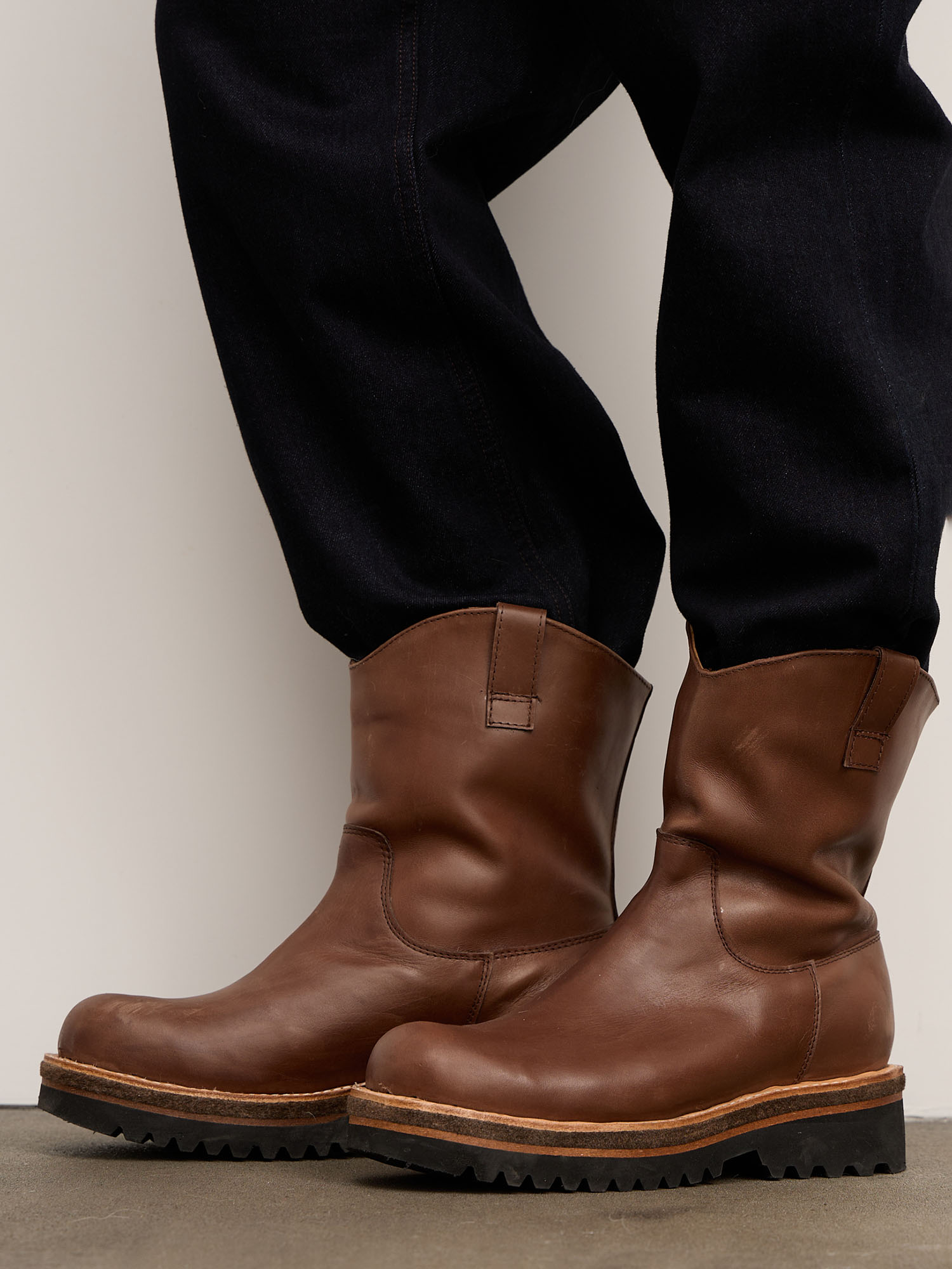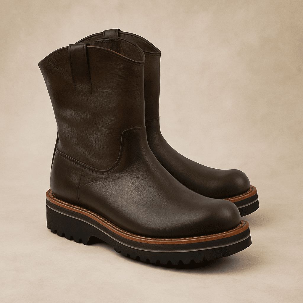 Лаконичная модель с прямым силуэтом и мягким голенищем. Массивная подошва придаёт обуви устойчивость и современный внешний вид.
