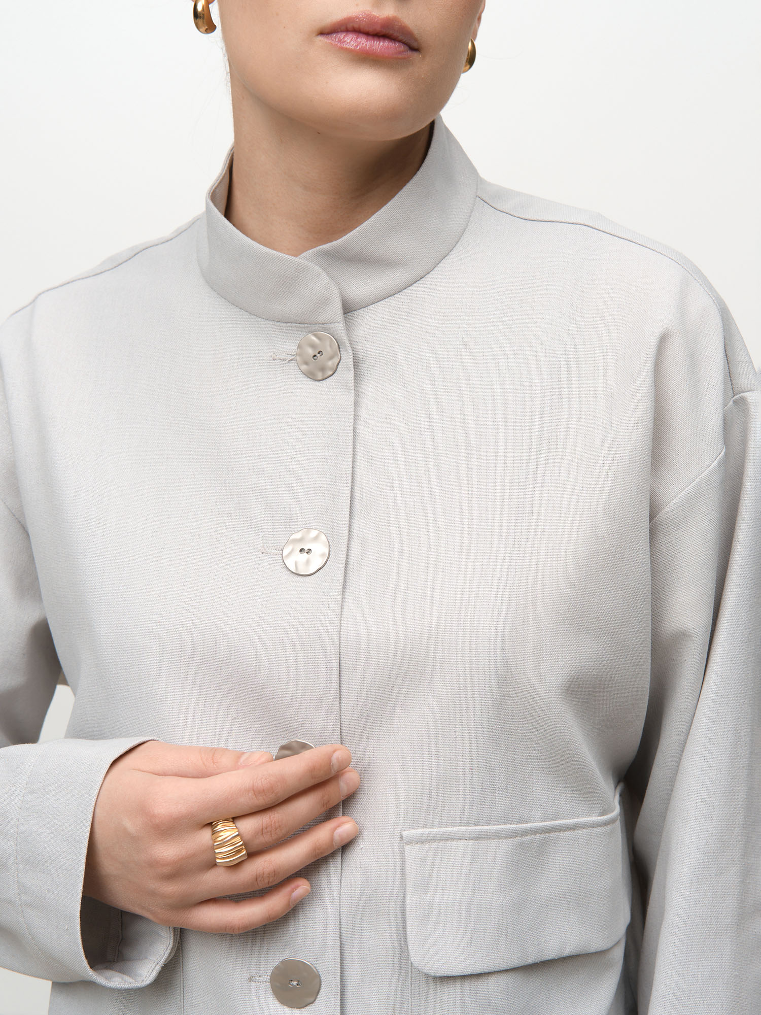 Застежка на пуговицы, накладные карманы, воротник-стойка, аккуратная обработка швов, легкая текстура ткани.