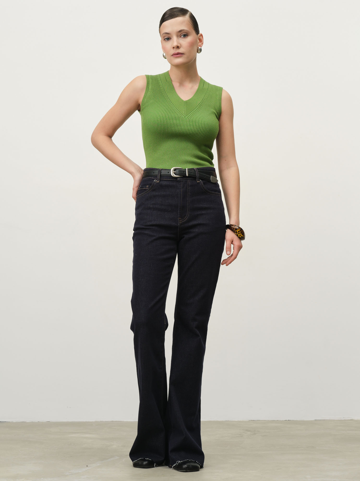 Приталенный силуэт с V-образным вырезом, визуально удлиняющим линию шеи. Фактурная вязка добавляет глубину и интерес к образу.