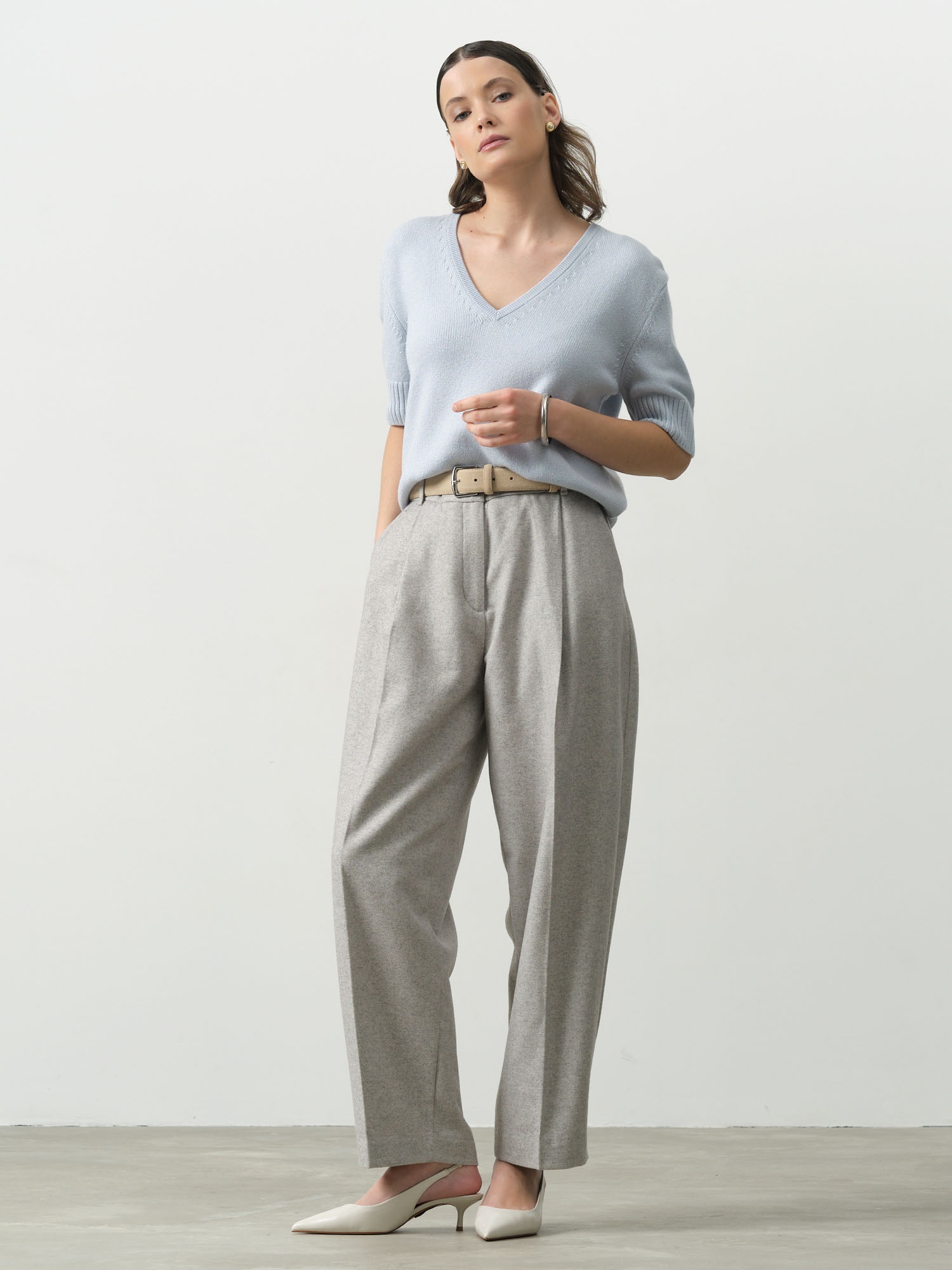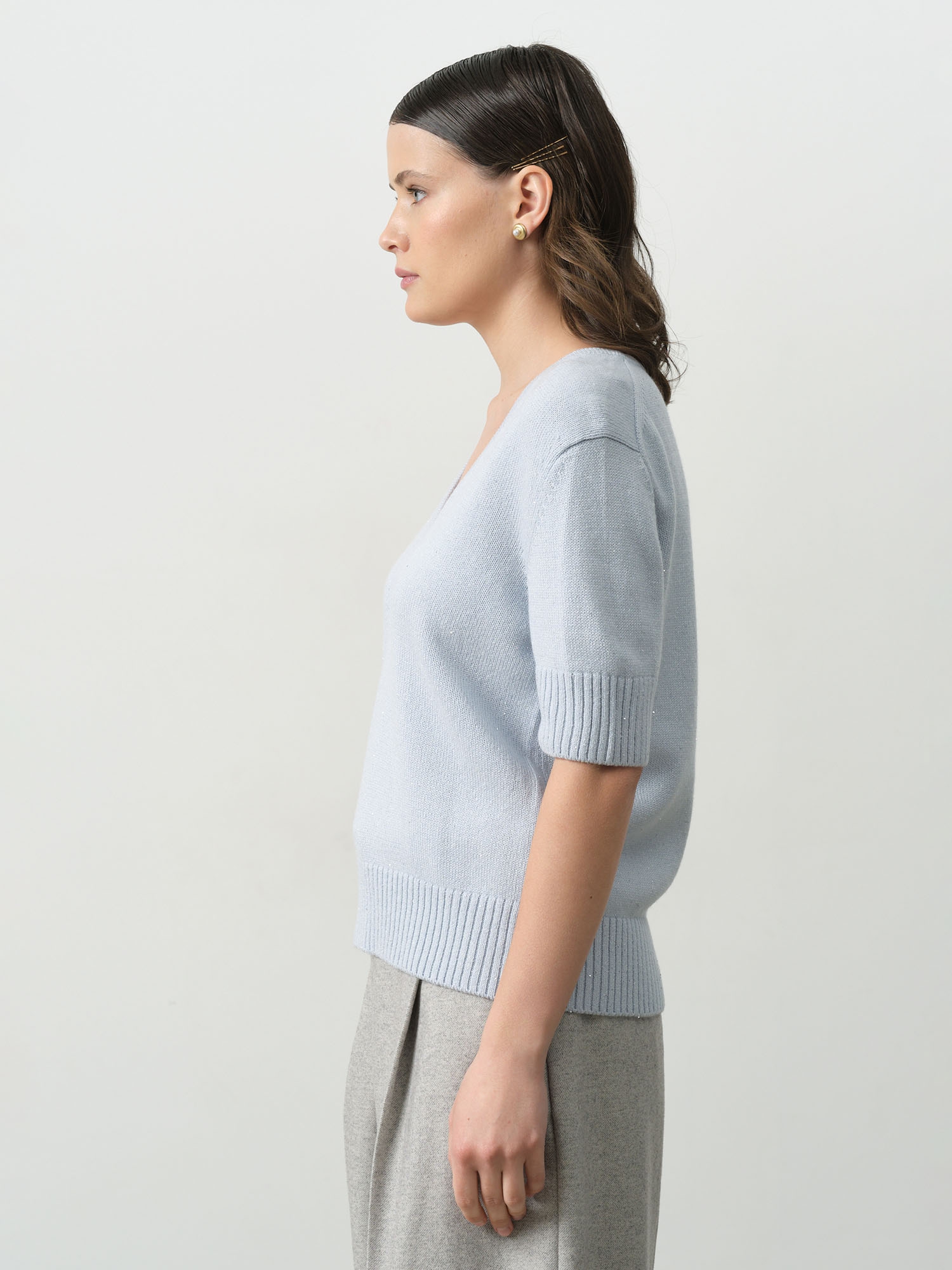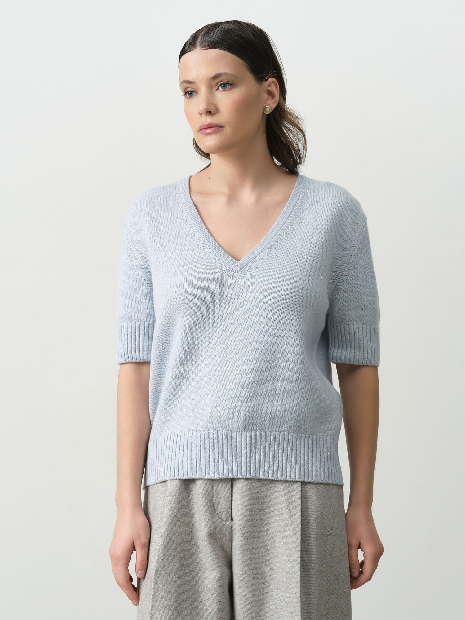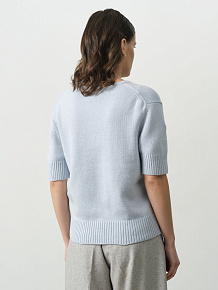 Модель выполнена в расслабленном крое с короткими рукавами и V-образным вырезом. Нити люрекса придают поверхности лёгкое мерцание, которое особенно красиво проявляется при естественном или вечернем освещении. Джемпер мягкий, приятный к телу, не колется и отлично держит форму.