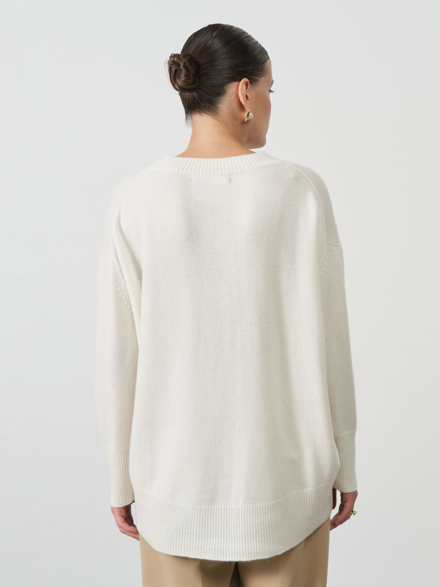 Безупречная гладкая текстура вязки и удлиненная линия спинки формируют утонченный силуэт. Легкая и уютная модель адаптируется к различным жизненным ситуациям: от деловых встреч в сочетании с классическими брюками до романтических прогулок в комбинации с воздушными юбками.