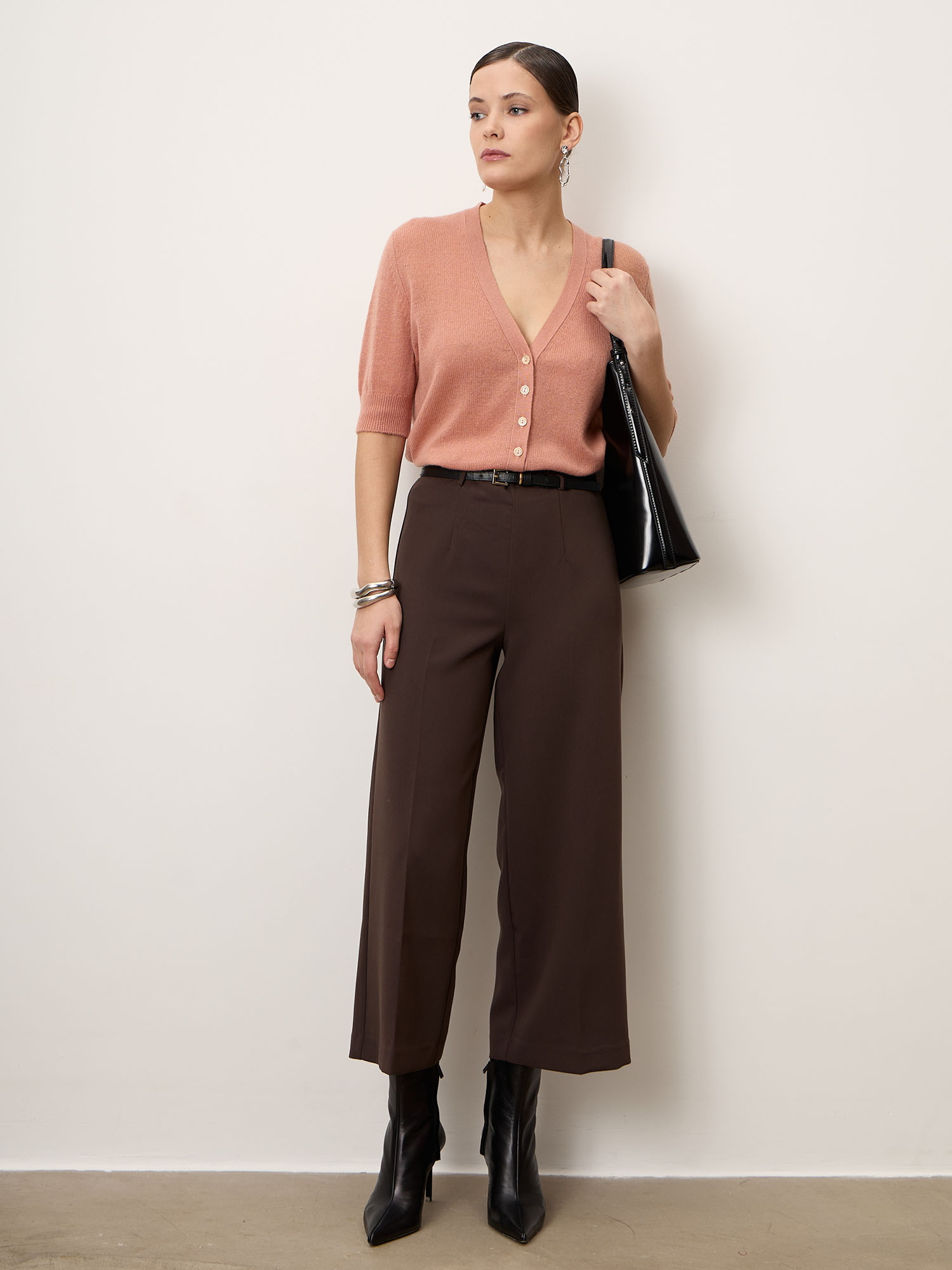• Короткий рукав — современный, утончённый акцент, позволяющий сочетать кардиган с топами, рубашками и платьями.